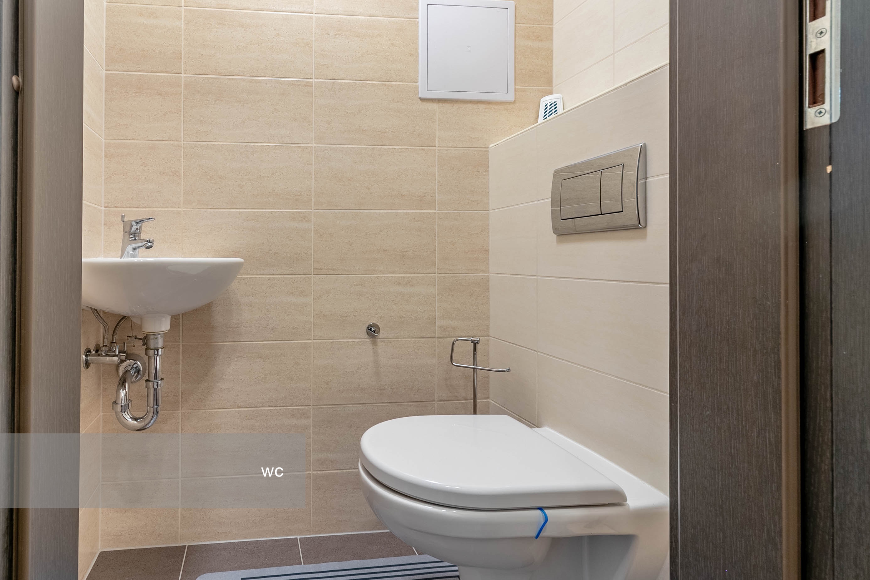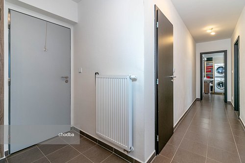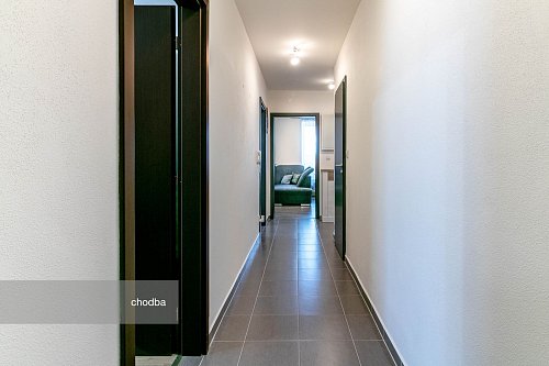 Byt má hezkou dispozici - prostornou chodbu, dva samostatné pokoje, velikou koupelnu s přirozeným větráním díky velikému oknu, samostatné WC s umyvadlem a obývací pokoj s kuchyňským koutem, ze kterého je vstup na balkon.
